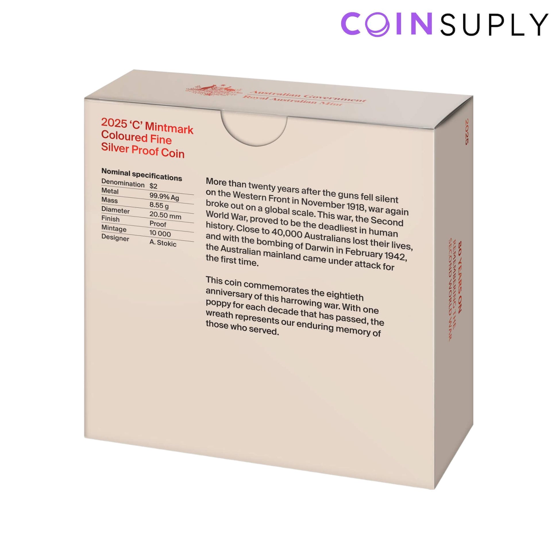 The First World War unfortunately did not turn out to be the 'war to end all wars'. Just over 20 years after it came to an end on 11 November 1918, another global conflict broke out. Nazi Germany's invasion of Poland on 1 September 1939 was the beginning of the Second World War - the deadliest and most destructive conflict in human history. The Second World War brought the threat of hostile foreign powers closer to home than ever. Darwin and other areas of northern Australia were bombed by Japanese forces in 1942 and 1943, with the first most damaging air raid in February 1942 killing over 250 civilians and service personnel. On 2 September 1945, the war came to an end at last with Japan's formal surrender, which followed Germany's surrender in May that year. Commemorating the eightieth anniversary of the end of the Second World War, the Royal Australian Mint presents this 2025 $2 'C' Mintmark Coloured Fine Silver Proof Coin. The coin's reverse features a remembrance wreath, which comprises eight red poppies to represent the eight decades that have passed since the end of the war.