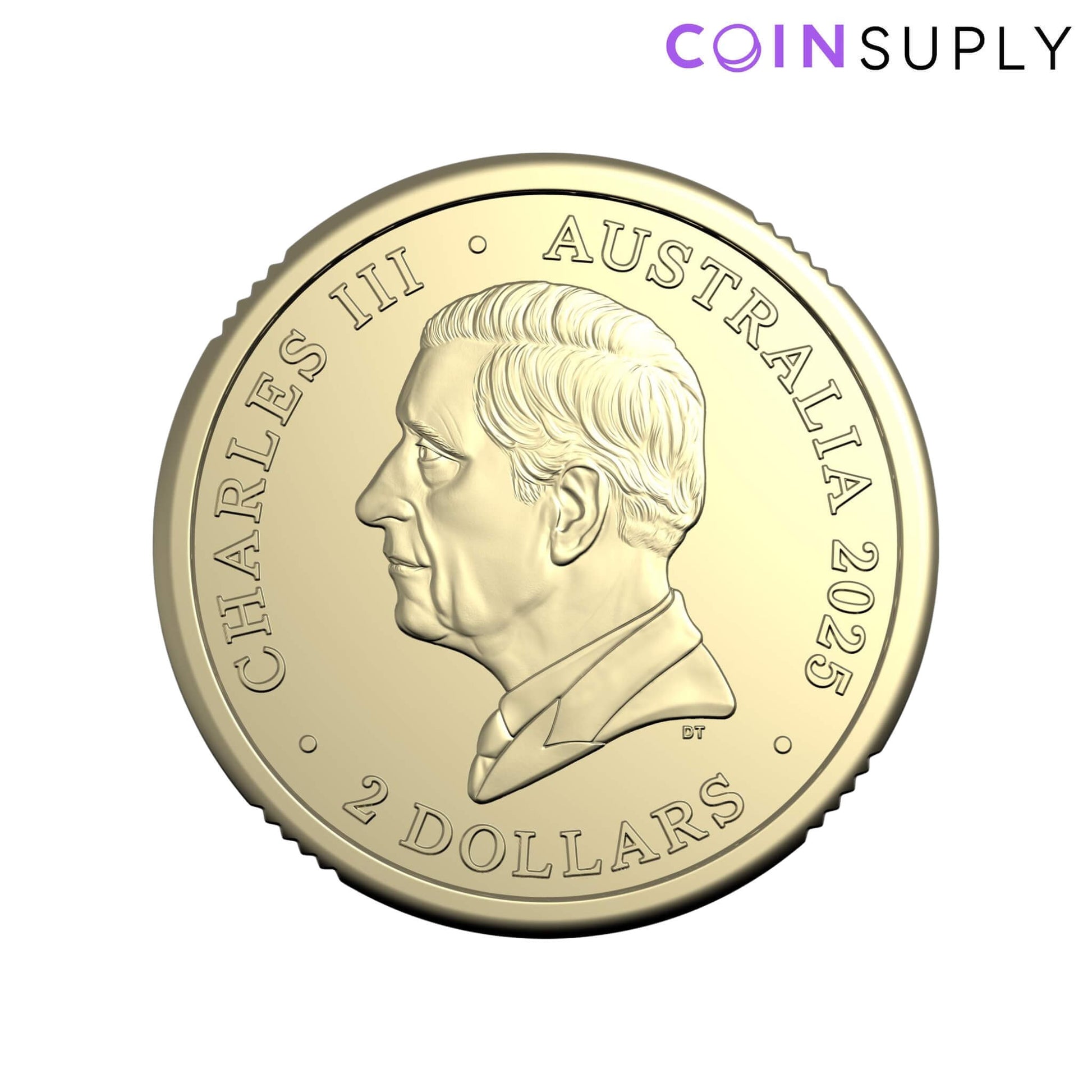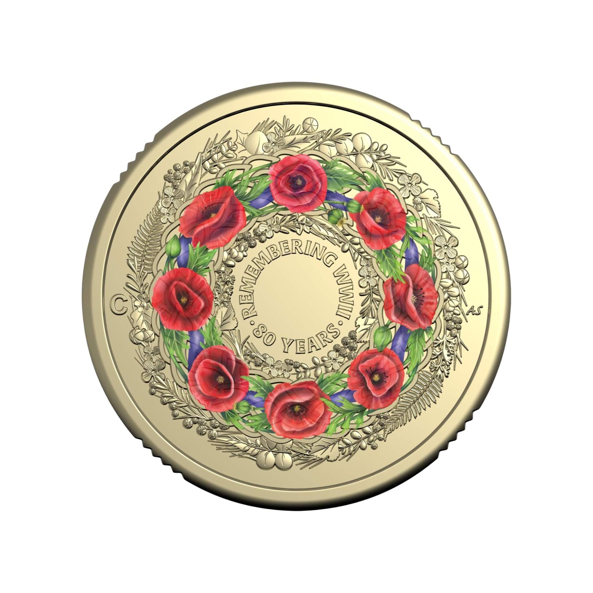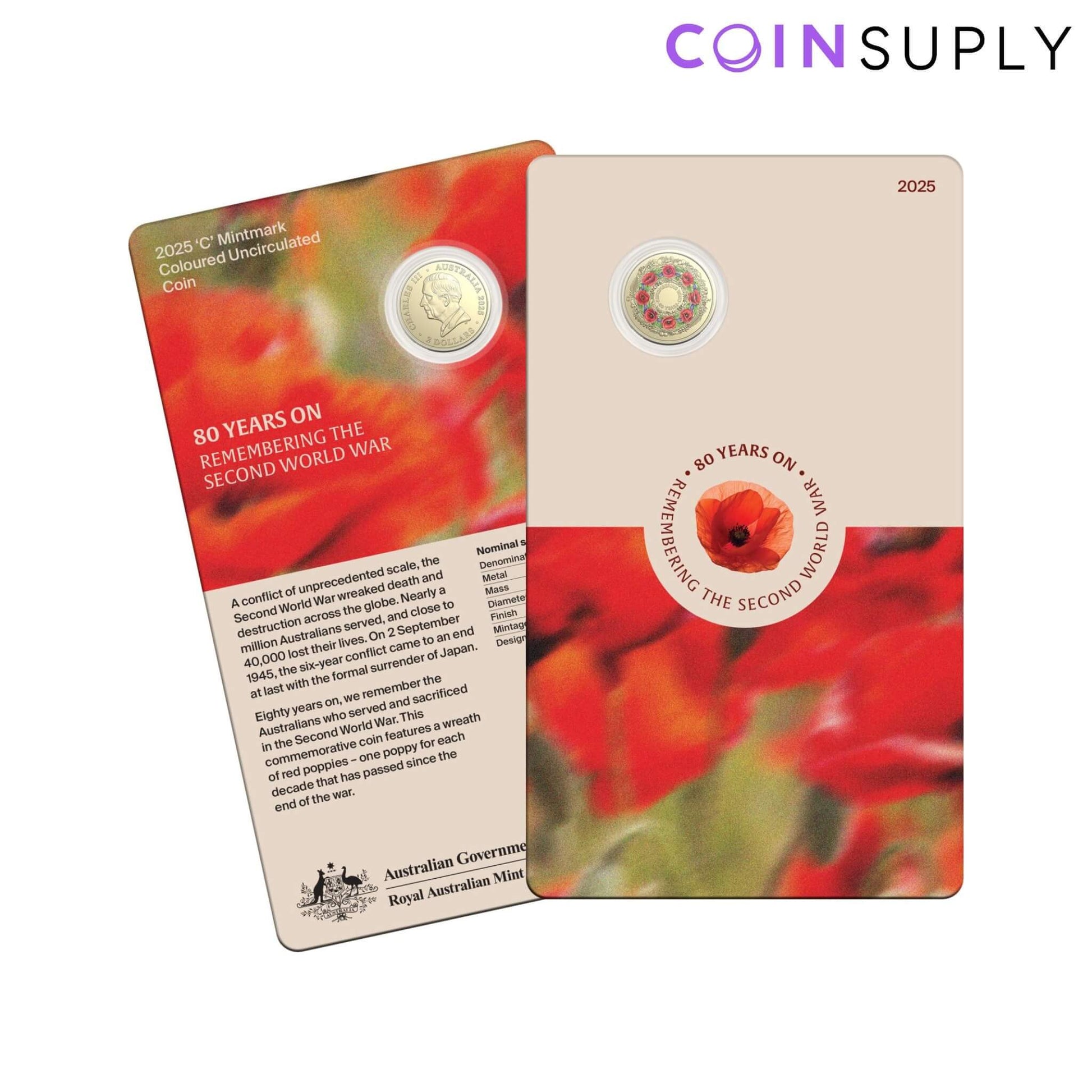 The First World War unfortunately did not turn out to be the 'war to end all wars'. Just over 20 years after it came to an end on 11 November 1918, another global conflict broke out. Nazi Germany's invasion of Poland on 1 September 1939 was the beginning of the Second World War - the deadliest and most destructive conflict in human history. The Second World War brought the threat of hostile foreign powers closer to home than ever. Darwin and other areas of northern Australia were bombed by Japanese forces in 1942 and 1943, with the first most damaging air raid in February 1942 killing over 250 civilians and service personnel. On 2 September 1945, the war came to an end at last with Japan's formal surrender, which followed Germany's surrender in May that year. Commemorating the eightieth anniversary of the end of the Second World War, the Royal Australian Mint presents this 2025 $2 'C' Mintmark Coloured Uncirculated Coin in a display card. The coin's reverse features a remembrance wreath, which comprises eight red poppies to represent the eight decades that have passed since the end of the war.